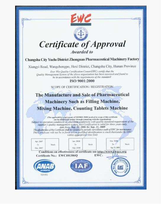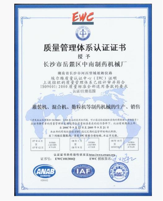 經(jīng)過3年的努力,我廠認(rèn)真按國(guó)際6S規(guī)范辦事,終結(jié)碩果。2006年9月,EWC國(guó)際認(rèn)證中心對(duì)我廠全方位嚴(yán)格評(píng)審,一舉通過ISO9001:2000質(zhì)量標(biāo)準(zhǔn)全部適用條款。該證書的取得,標(biāo)志著我廠全面質(zhì)量管理從此躍上了一個(gè)嶄新的臺(tái)階,也為我廠產(chǎn)品走向世界鋪出了一條綠色通道。