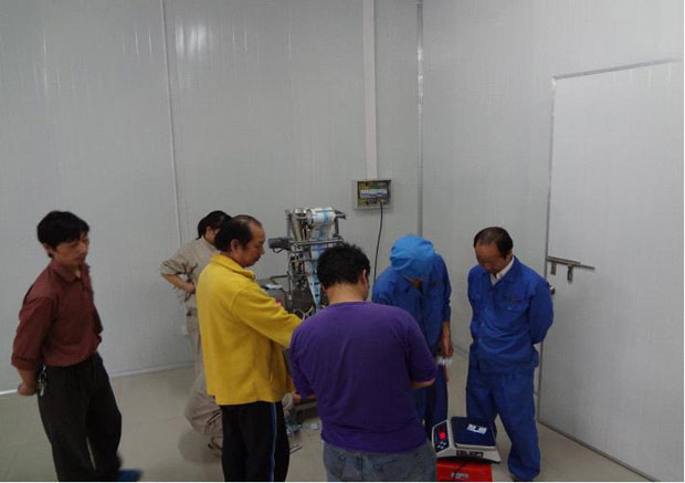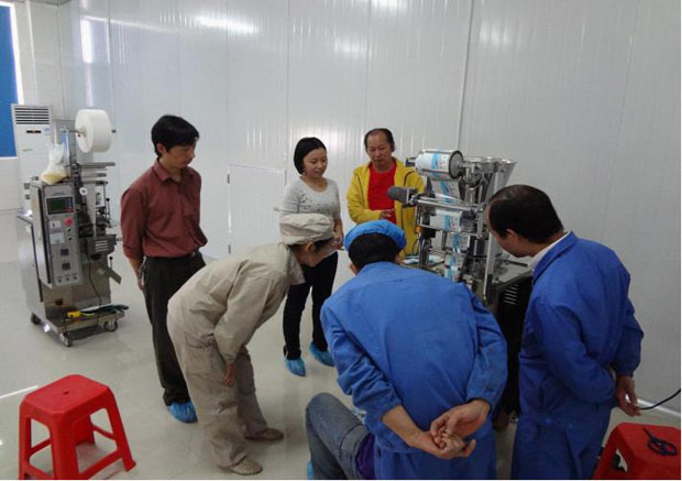 圖為千金養(yǎng)生坊健康品股份有限公司生產(chǎn)部黃玲芳主任率員工驗收ZKB-K顆粒包裝機實況。
