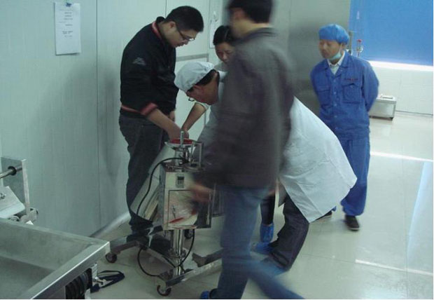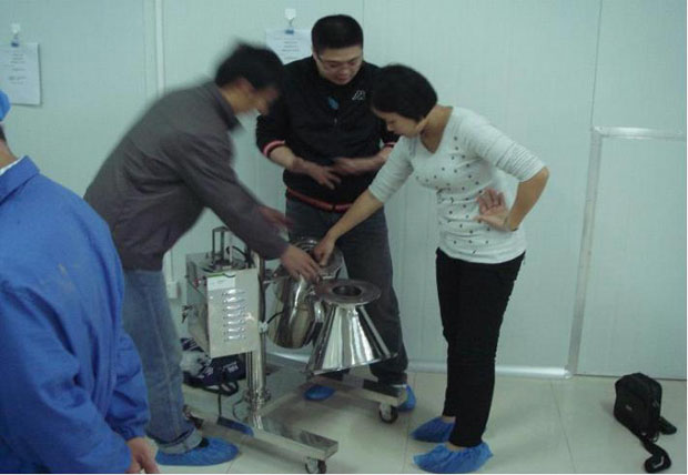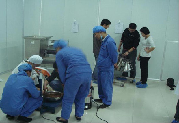 圖為千金養(yǎng)生坊健康品股份有限公司生產(chǎn)部黃玲芳主任率員工驗(yàn)收KZ-180型快速整粒機(jī)實(shí)況。
