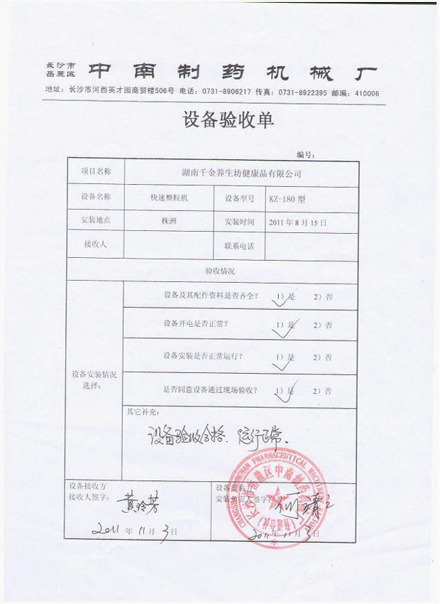 2011年10月,千金養(yǎng)生坊健康品有限公司向我廠購買了KZ-180型快速整粒機(jī)、ZKB-K型顆粒包裝機(jī)、DZ-60型全自動制丸機(jī)、LM型煉蜜機(jī)、RXH-48盤熱循環(huán)烘箱、CH-200型混合機(jī)、YK-160型重型顆粒機(jī)、GF-30B型帶除塵渦輪自冷式粉碎機(jī)組等設(shè)備。現(xiàn)已投入使用。