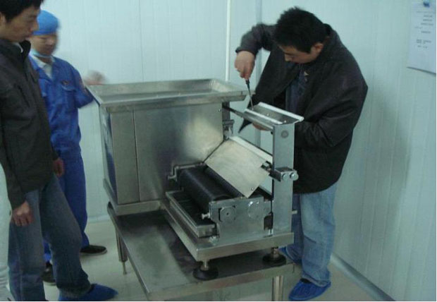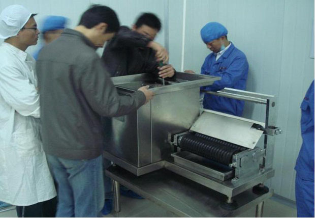 我廠生產(chǎn)的DZ-60型全自動制丸機(jī),主要技術(shù)特點有兩點:一是混合物料進(jìn)入工作腔后,特制螺桿可以將物料再一次擠揉,使從工作腔出來的物料成條形狀好,干濕度、粘稠度合適,便入下一步制丸,如物料出條不好,還可以多次擠揉,達(dá)到理想程度。二是制丸成型滾輪可精細(xì)調(diào)節(jié),便于下條順利和成型美觀。