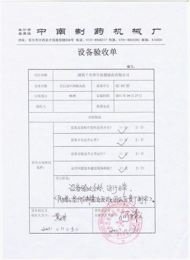2011年10月,湖南株洲千金養(yǎng)生坊健康品有限公司向我廠購買了DZ-60型全自動制丸機(jī)、ZKB-K型顆粒包裝機(jī)、LM型煉蜜機(jī)、RXH-48盤熱循環(huán)烘箱、KZ-180型快速整粒機(jī)、CH-200型混合機(jī)、YK-160型重型顆粒機(jī)、GF-30B型帶除塵渦輪自冷式粉碎機(jī)組等設(shè)備,F(xiàn)已投入使用。