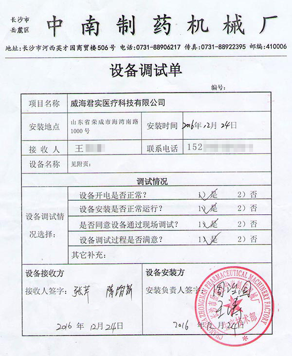 威海海洋職業(yè)學院經(jīng)過全面考察對比,最終選擇了我廠生產(chǎn)的成套制藥設備生產(chǎn)線,包括:片劑設備、全自動膠囊填充機、顆粒粉劑設備、口服液制劑設備等27種制藥設備,2016年12月24日經(jīng)過我廠專業(yè)技術(shù)人員上門安裝調(diào)試,全套設備生產(chǎn)線全面調(diào)試安裝驗收完成,客戶對我們的專業(yè)服務給予了高度評價。