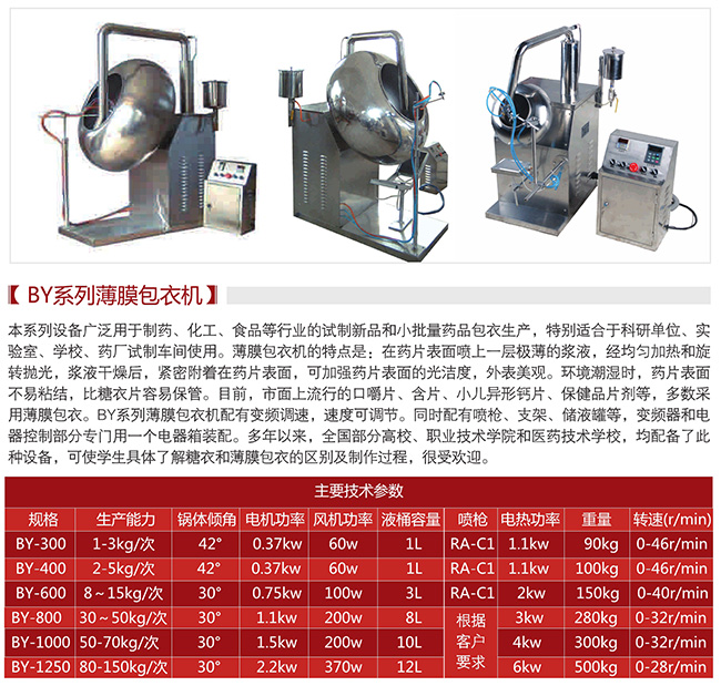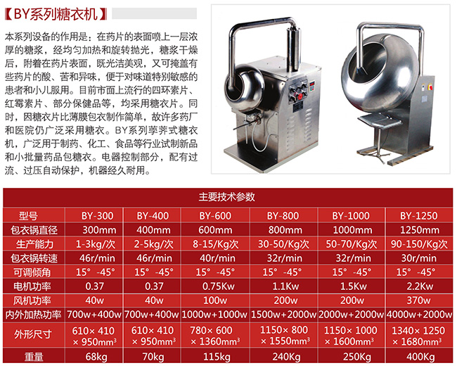 BY系列荸薺式糖衣機(jī),廣泛用于制藥、化工、食品等行業(yè)試制新品和小批量藥品包糖衣生產(chǎn)。電器控制部分,配有過(guò)流、過(guò)壓自動(dòng)保護(hù),機(jī)器經(jīng)久耐用。
