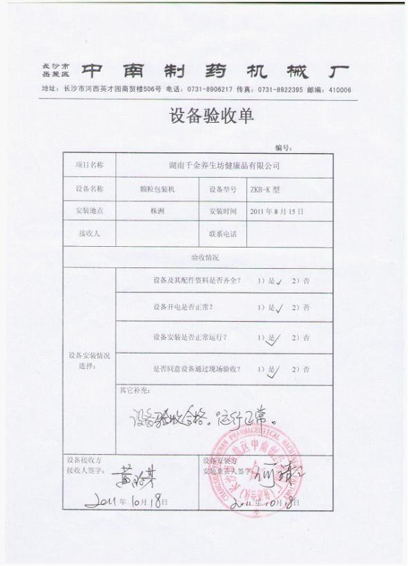 湖南株洲千金藥業(yè)是一家上市公司,主要生產婦科用藥。2011年10月,該公司月向我廠購買了ZKB-K型顆粒包裝機、DZ-60型全自動制丸機、LM型煉蜜機、RXH-48盤熱循環(huán)烘箱、KZ-180型快速整粒機、CH-200型混合機、YK-160型重型顆粒機、GF-30B型帶除塵渦輪自冷式粉碎機組等設備,F已投入使用。