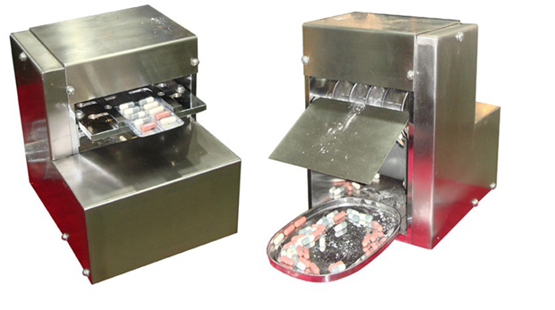 JT-1型膠囊剔出機,是鋁塑包裝機的配套產品。在鋁塑包裝過程中,由于藥粒碎片、熱封不良、充填遺漏、PVC塑料硬片泡罩成型不完全等原因,難免出現廢品板塊。為了回收利用,需用人工將廢品版塊內藥粒擠出,既浪費人力,又不同程度造成人為二次污染。