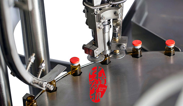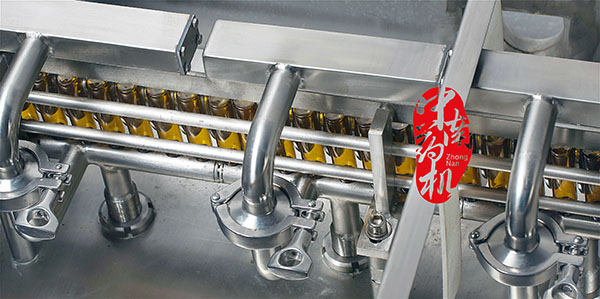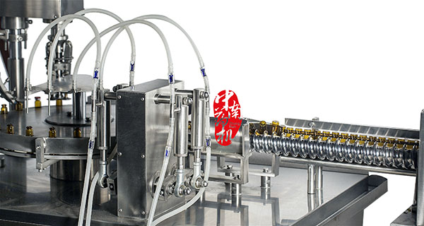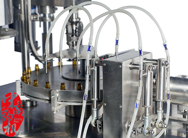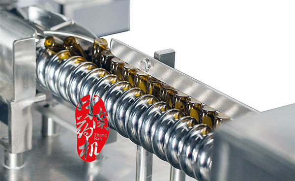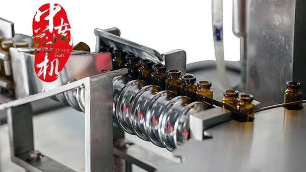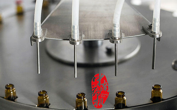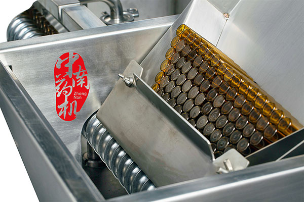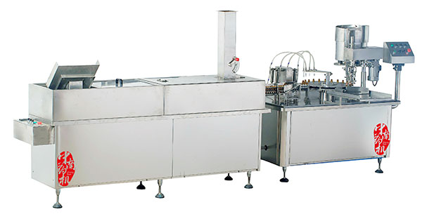 瓶子經(jīng)自來(lái)水(或回用水)及去離子水內(nèi)外沖洗,再由凈化壓縮空氣吹去表面的水珠,然后進(jìn)入烘干段烘干。瓶子出烘箱,進(jìn)入灌封機(jī)進(jìn)行灌裝軋蓋??膳c燈檢機(jī),貼標(biāo)機(jī)等設(shè)備連線。符合GMP要求。